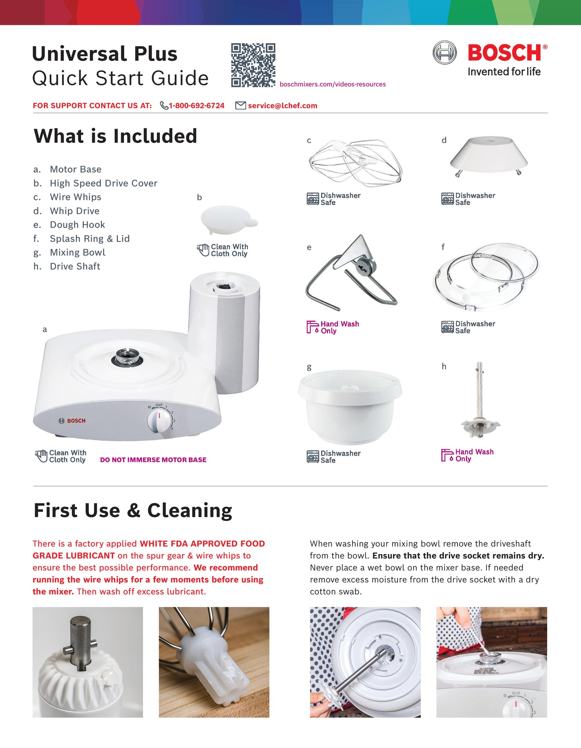 Dishwasher Safe: Plastic Whip Drive, Wire Whips, Plastic Bowl, Lid and Splash Ring, and Dough Hook Extender.